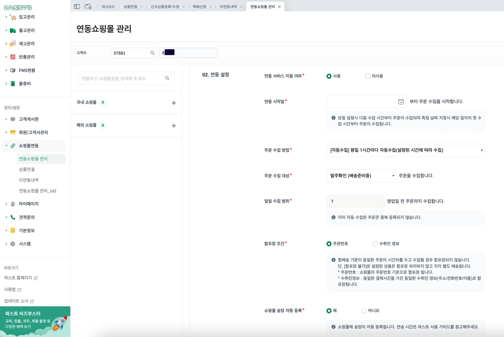 FMS [택배출고신청] 메뉴에서 쇼핑몰 주문수집/송장등록 기능을 통해 주문을 수집합니다.