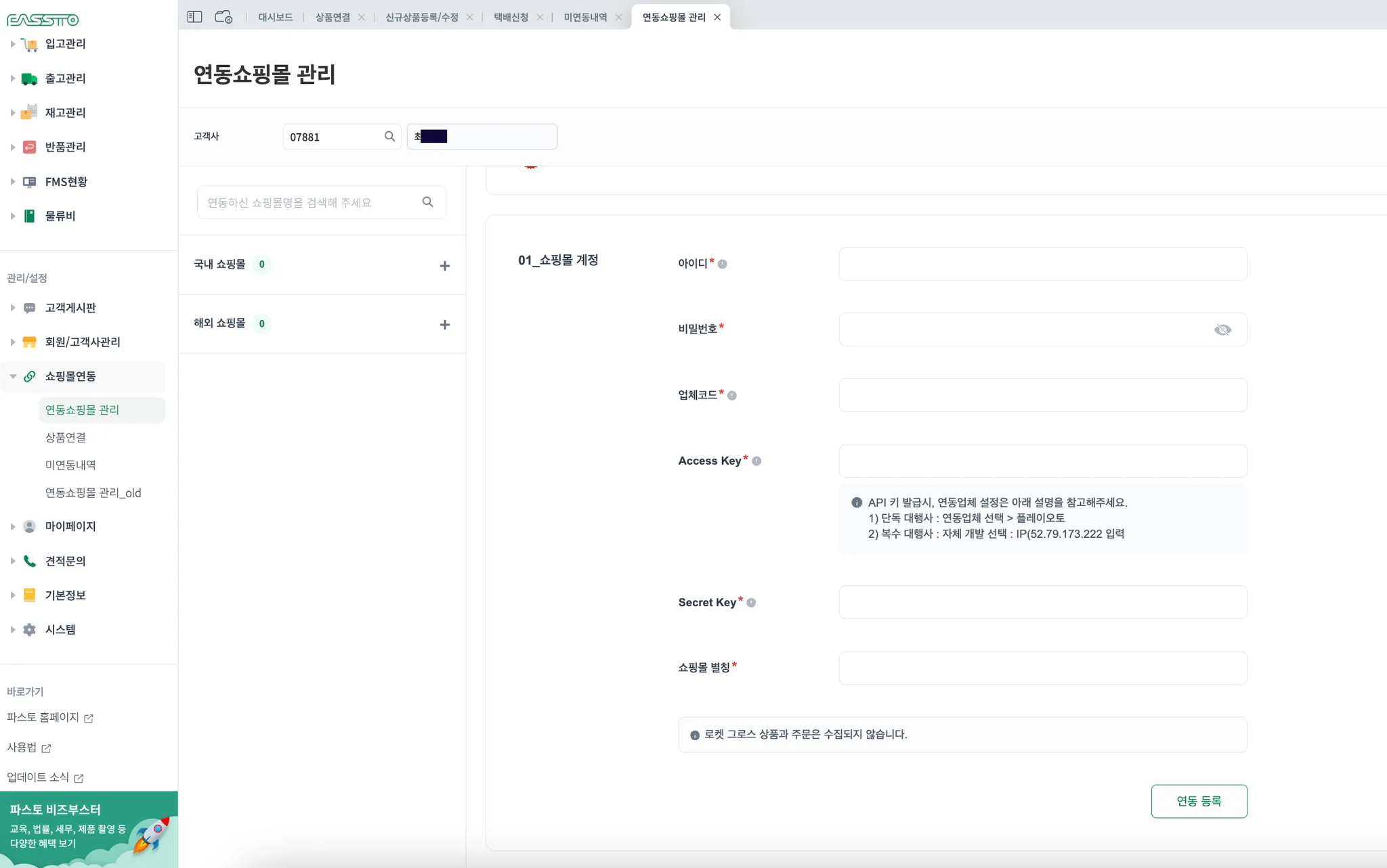 3) 연동쇼핑몰 관리에서 아래 정보를 입력 후 연동 등록을 진행해주세요.