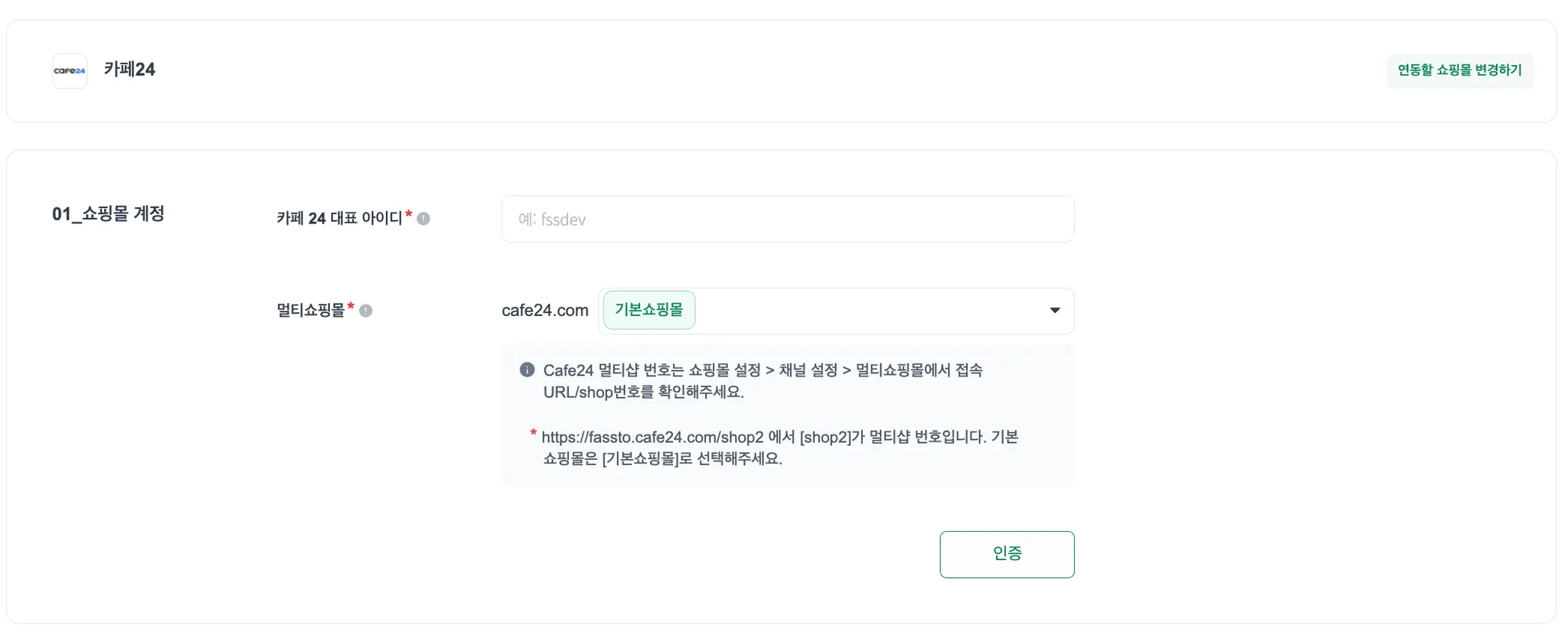2. 카페 24 대표 아이디와 멀티쇼핑몰을 입력해주세요.