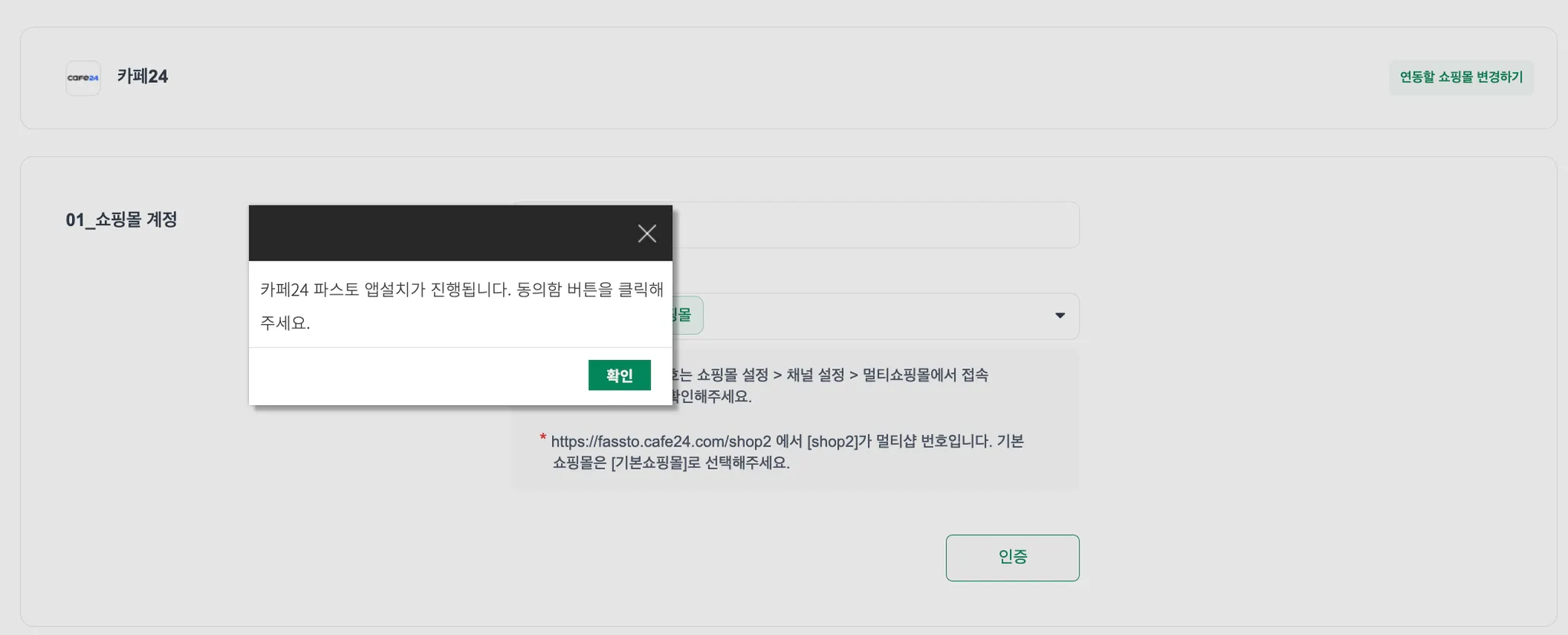카페 24에 파스토 앱설치가 완료되어야 정상 연동됩니다.