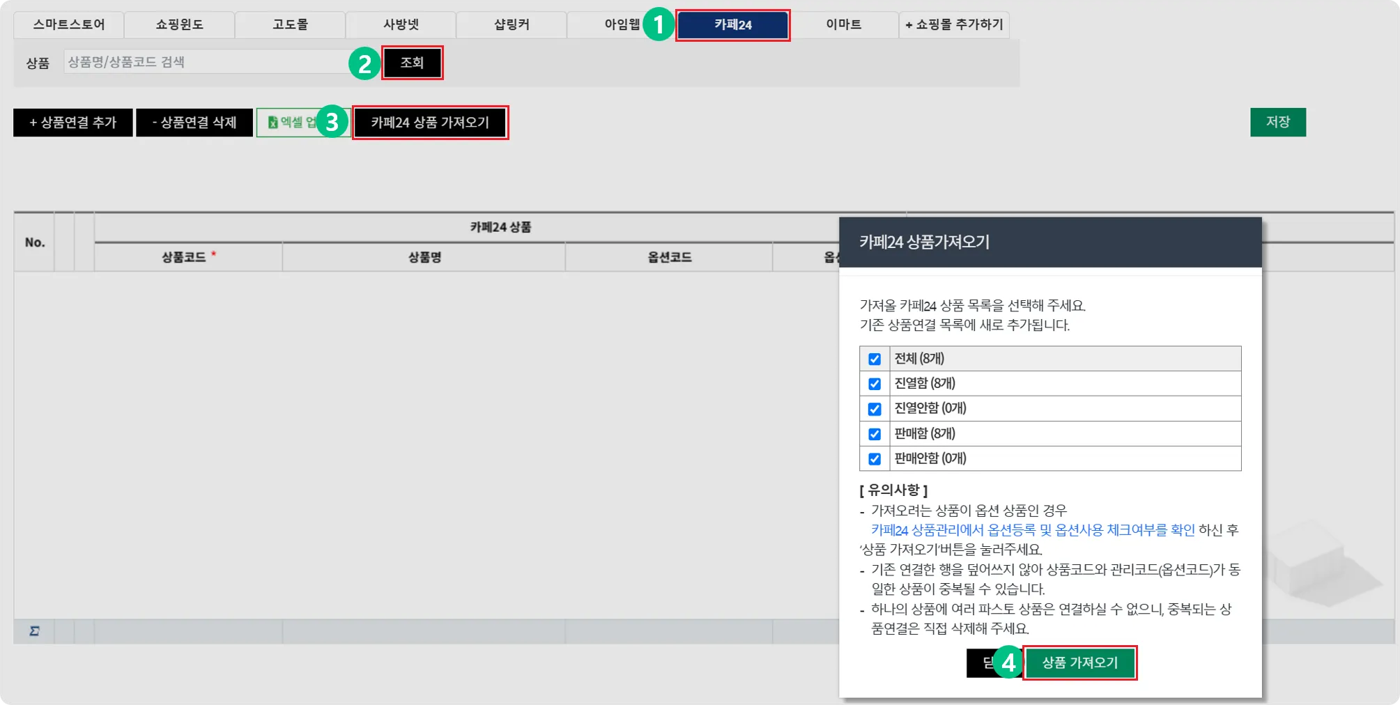 카페24 상품 가져오기를 클릭하면 [상품 가져오기] 팝업창이 나타납니다.