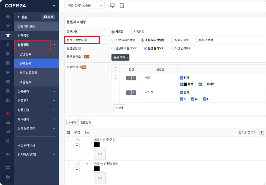 ※ 옵션상품은 옵션코드가 잘 입력되어 있는지 꼭 확인해주세요
