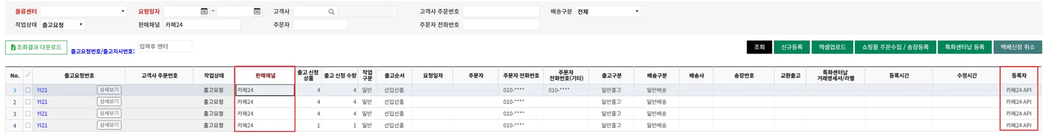 연동 설정 이후 연동 시각에 카페24 주문이 FMS 택배 출고 신청 메뉴에 정상적으로 연동되는지 확인합니다.