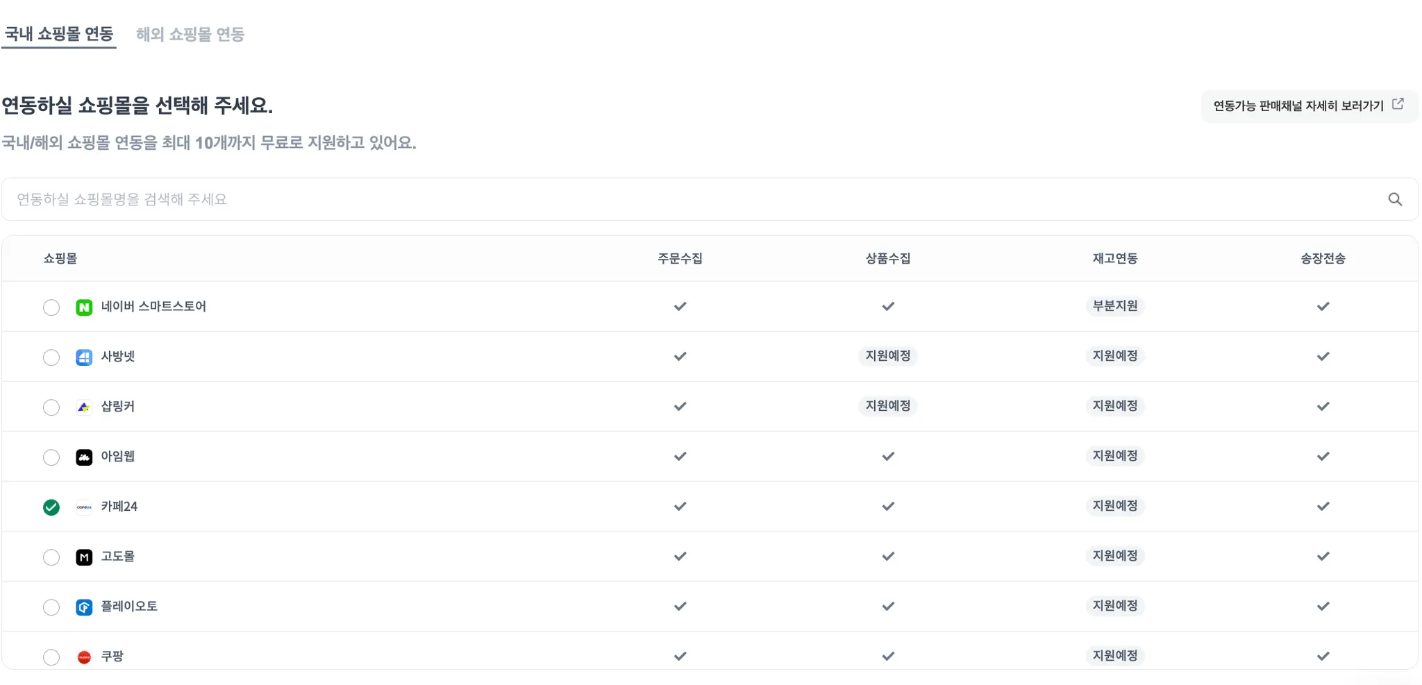 1. 쇼핑몰연동 > 연동 쇼핑몰 관리에서 카페 24를 선택해주세요.