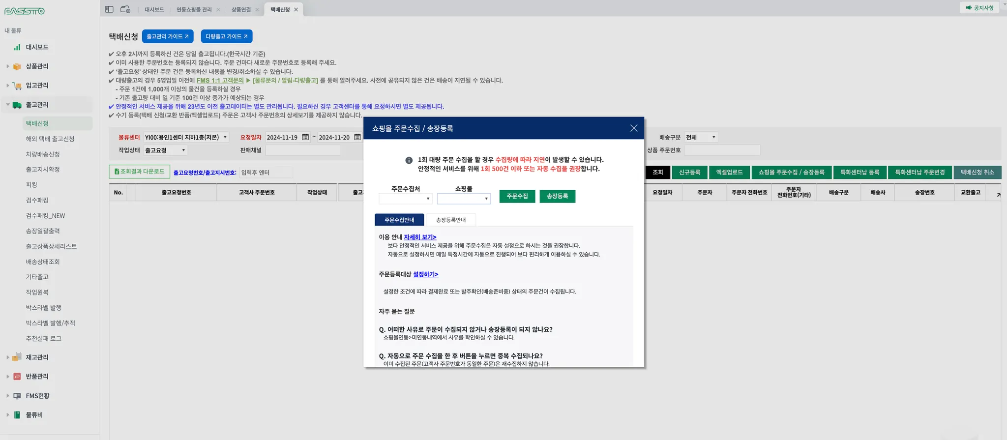 FMS [택배출고신청] 메뉴에서 쇼핑몰 주문수집/송장등록 기능을 통해 주문을 수집합니다.
