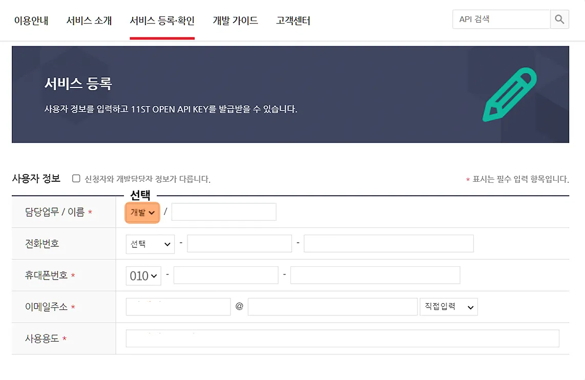 서비스 등록 > 확인에서 담당 업무를 개발로 선택하시고, 정보를 입력해주세요.
