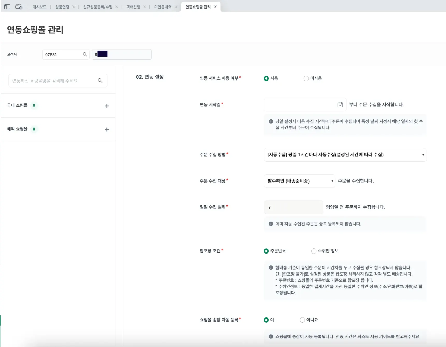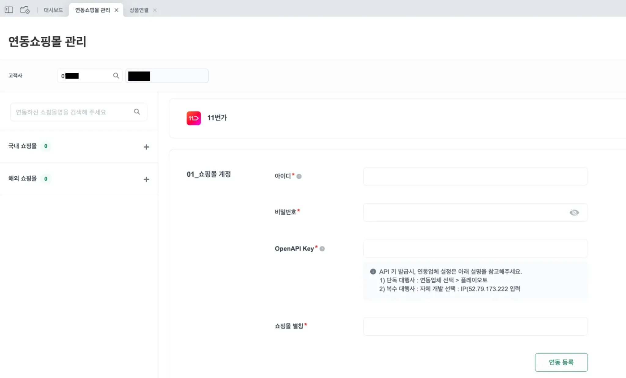 경로 : FMS → 쇼핑몰 연동 → 연동쇼핑몰 관리