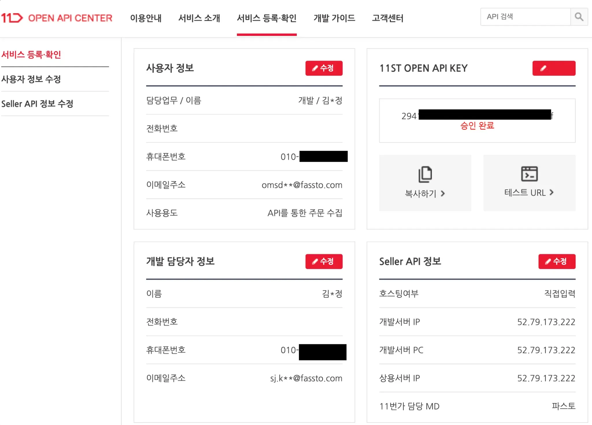 확인된 11ST OPEN API KEY를 복사해주세요.