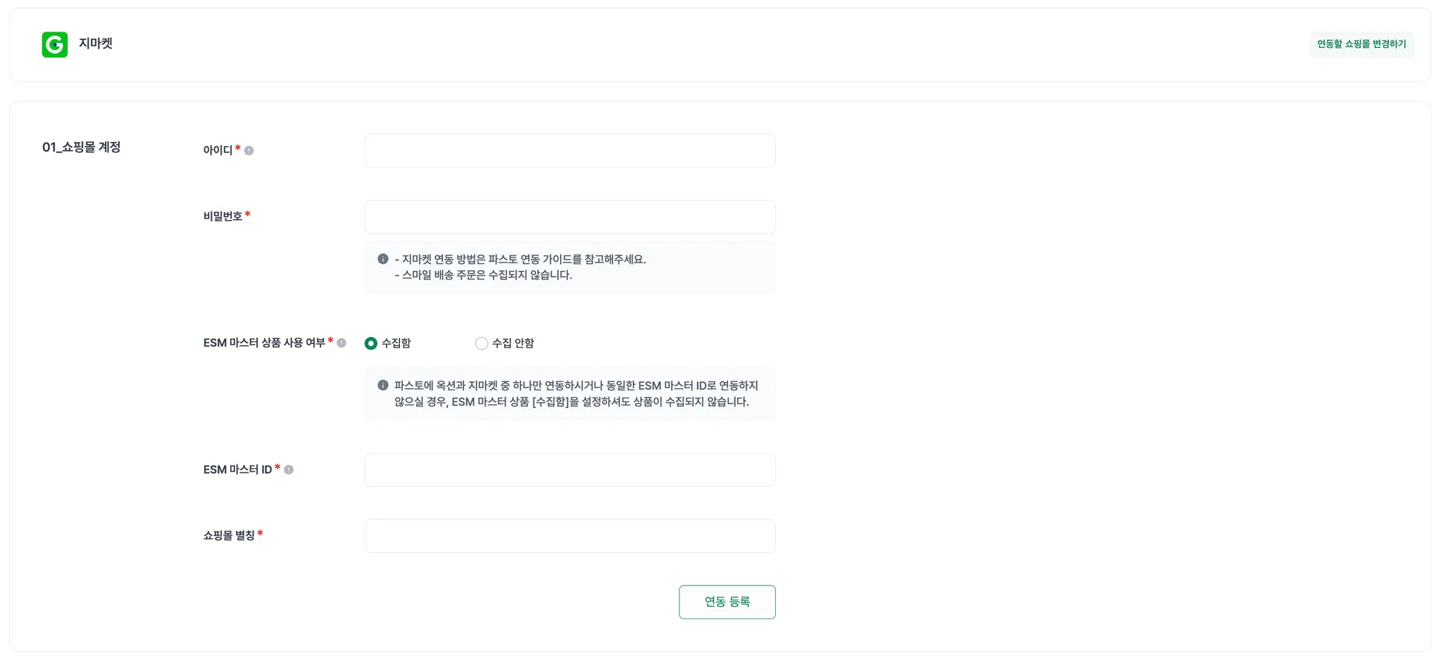 ESM 마스터 아이디 | 마스터 상품 ID를 입력해주세요. 옥션과 지마켓 모두 동일한 ESM 마스터 ID로 연동하지 않으실 경우, ESM 마스터 상품 [수집함]을 설정하셔도 상품이 수집되지 않습니다. |