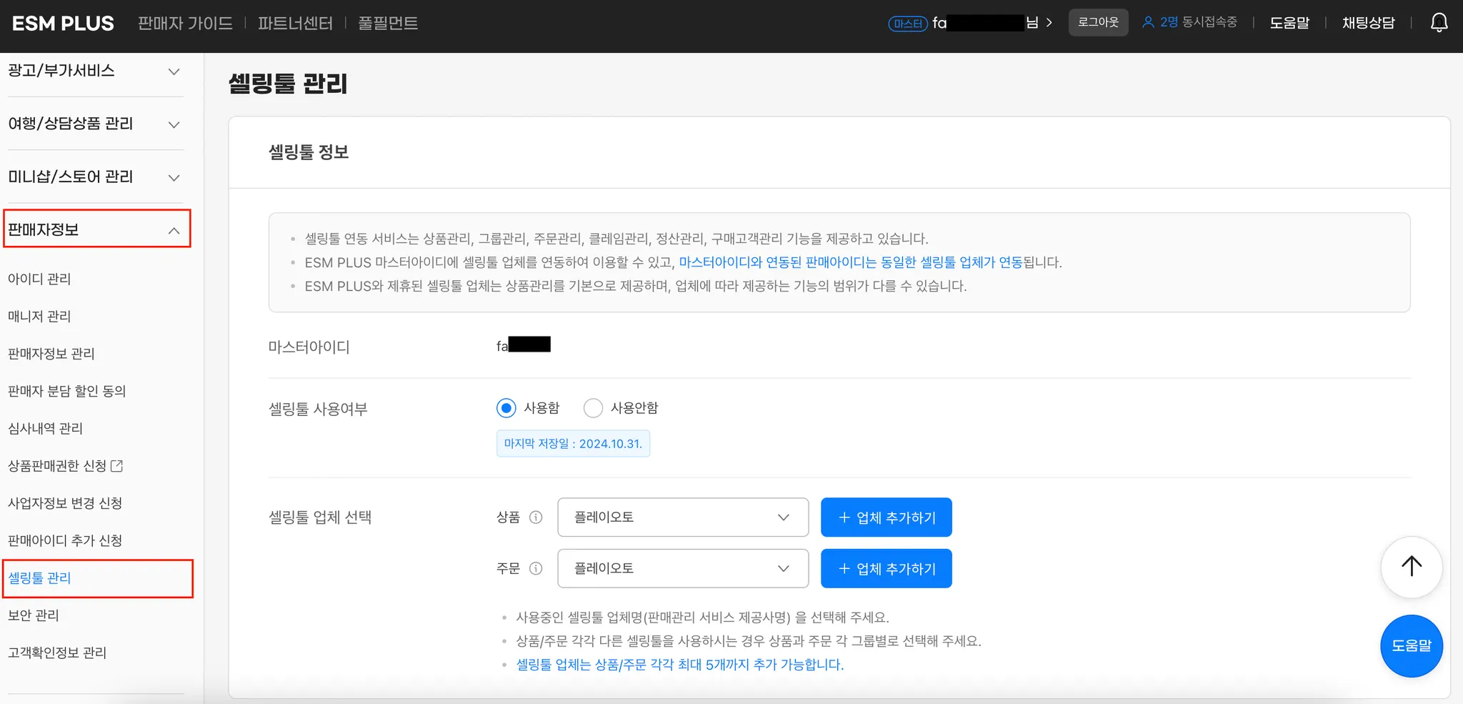 셀링툴 사용여부를 사용함으로 재변경 및 셀링툴 플레이오토 선택 후 저장해주세요.
