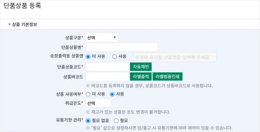 상품 입고는 쇼핑몰 연동 이후 진행하여도 무방하지만, 아래의 경우에는 쇼핑몰 연동 전에 입고가 선행되어야 합니다.