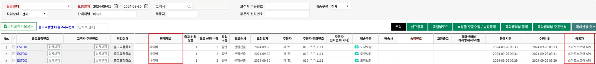 조건에 해당하는 스마트스토어 주문이 FMS 택배출고신청 내역으로 연동됩니다.