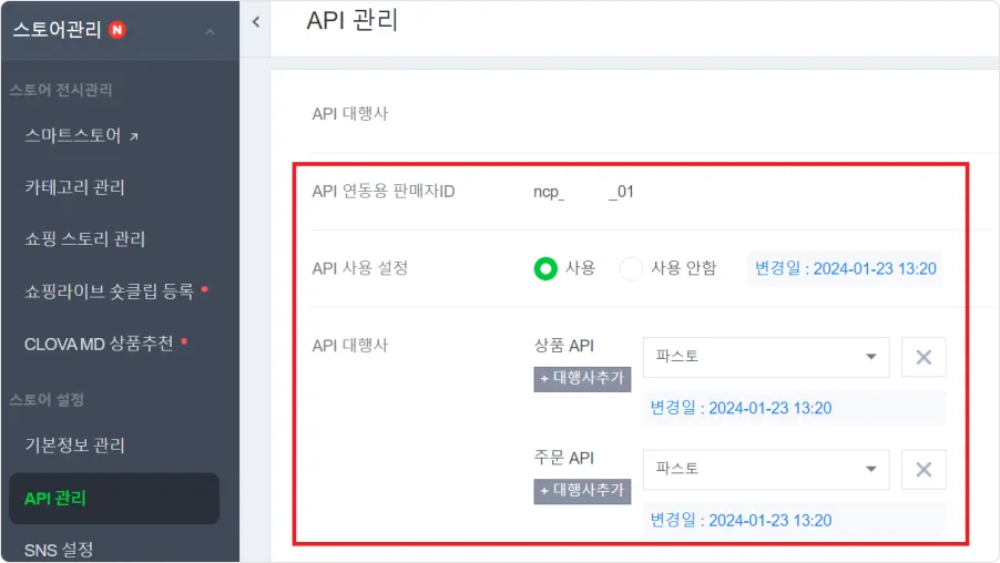 1) 스토어 관리 → API 관리] 경로로 접속하여, API를 사용 설정해주세요.