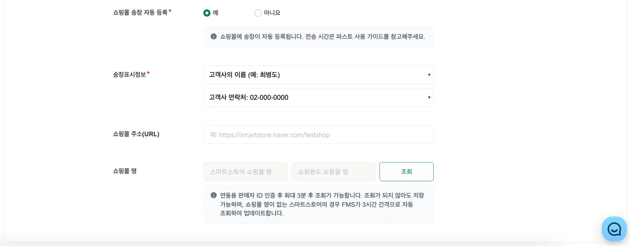 쇼핑몰 명 | 조회 버튼 클릭시 스마트스토어 쇼핑몰명이 자동 입력됩니다. |