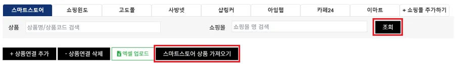 [쇼핑몰연동 - 상품연결] 경로로 접속하여, 조회 버튼과 스마트스토어 상품 가져오기 버튼을 클릭해주세요.