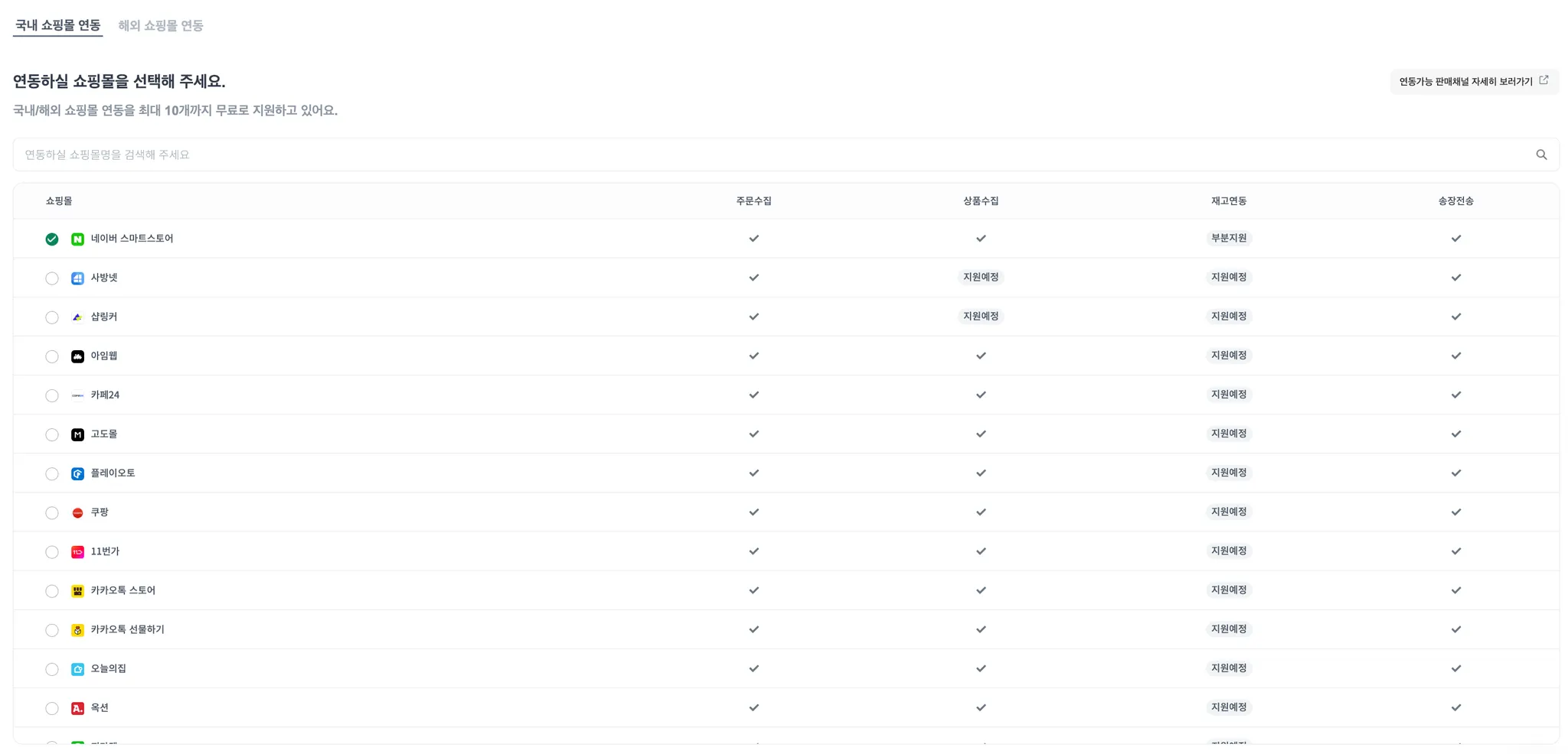 경로 : 쇼핑몰 연동 → 연동 쇼핑몰 관리에서 확인해주세요.