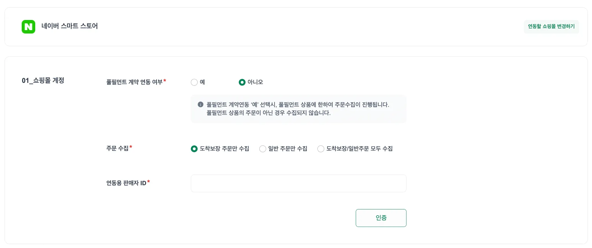 스마트스토어에서 확인한 판매자 ID를 연동용 판매자 ID에 입력