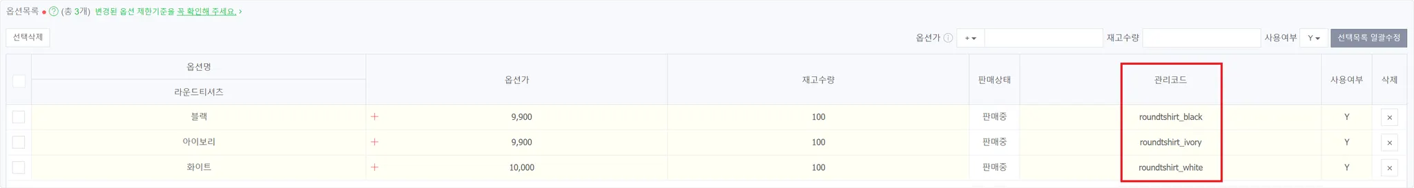 ※ 옵션상품은 관리코드가 잘 입력되어 있는지 꼭 확인해주세요