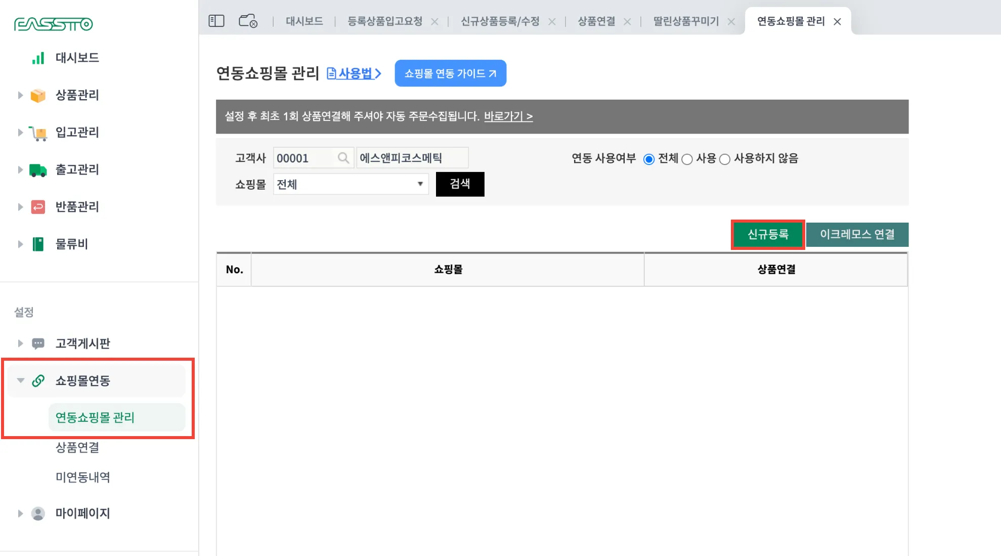 9. FMS의 [쇼핑몰연동] > [연동쇼핑몰 관리]에서 신규등록을 클릭하여 연동을 설정해 주세요.