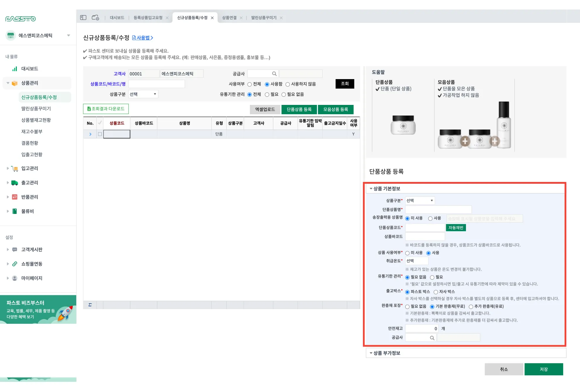 5. [상품관리] > [단품상품 등록] 에도 스마트스토어에 판매 중인 상품을 등록하세요.