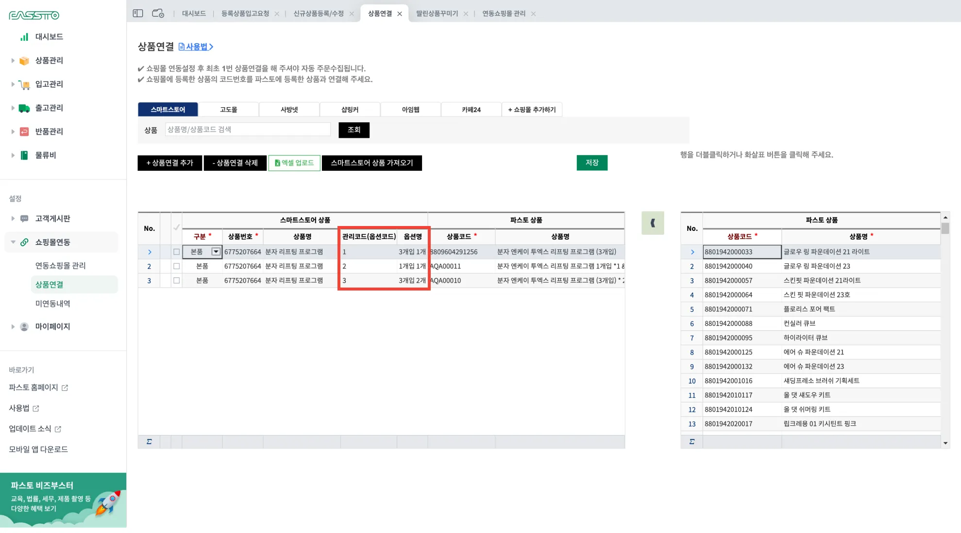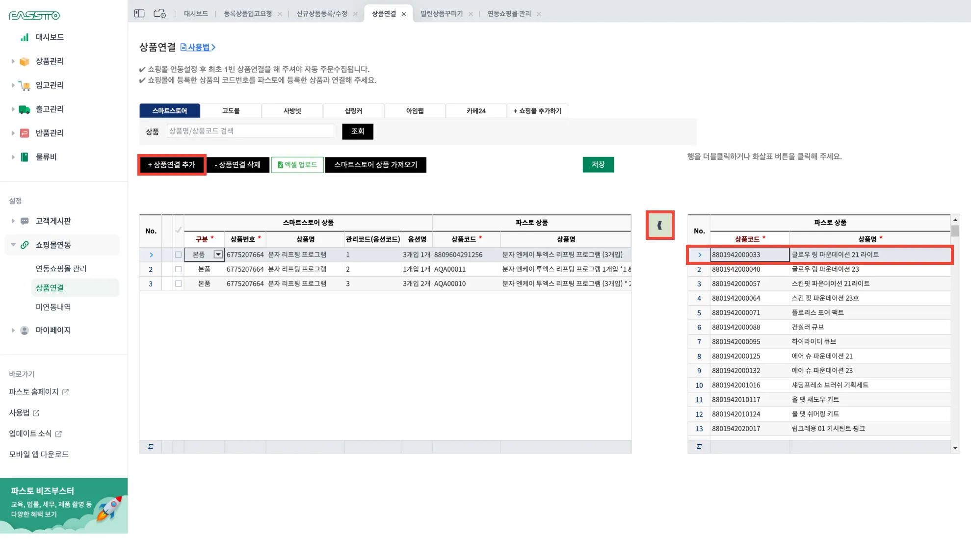6. [쇼핑몰연동] > [상품연결] 에서 스마트스토어 상품과 FMS 상품을 연결해 주세요.