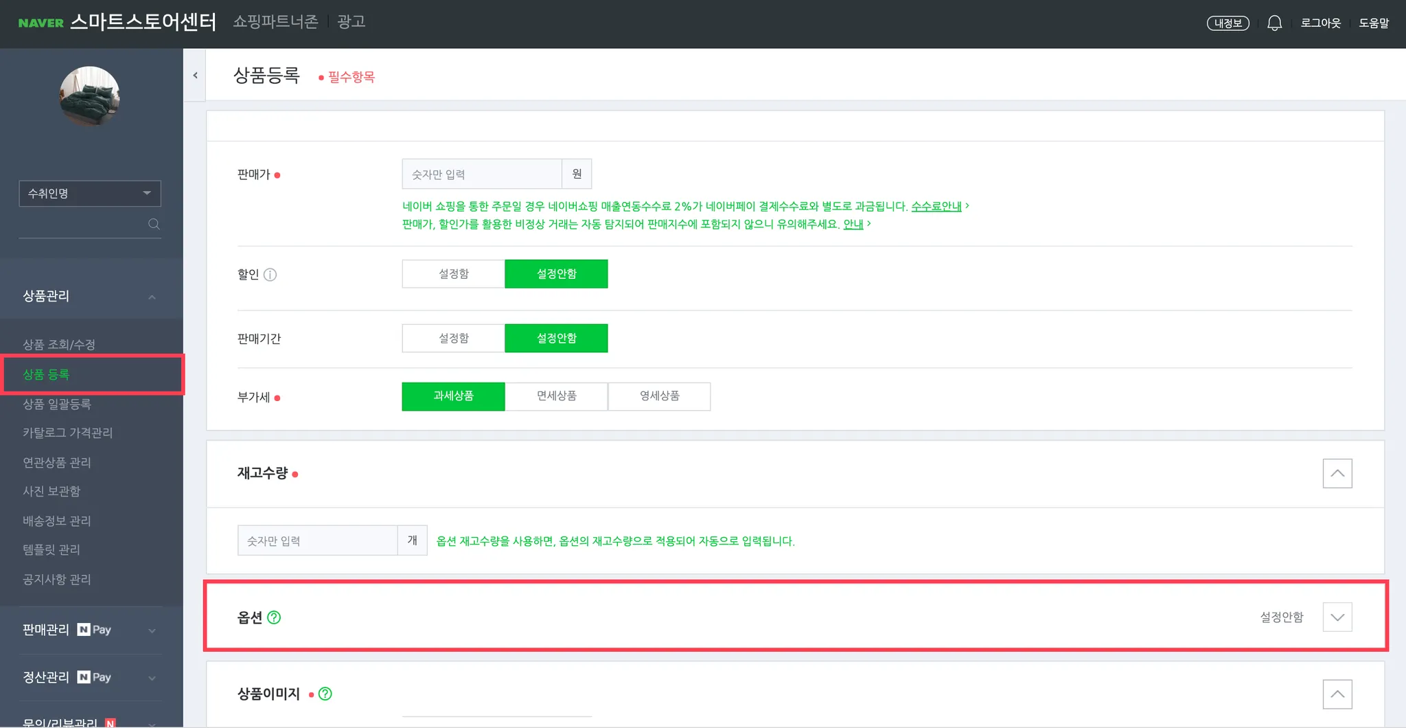 * 옵션 상품이 아닌 경우 건너뛰세요.