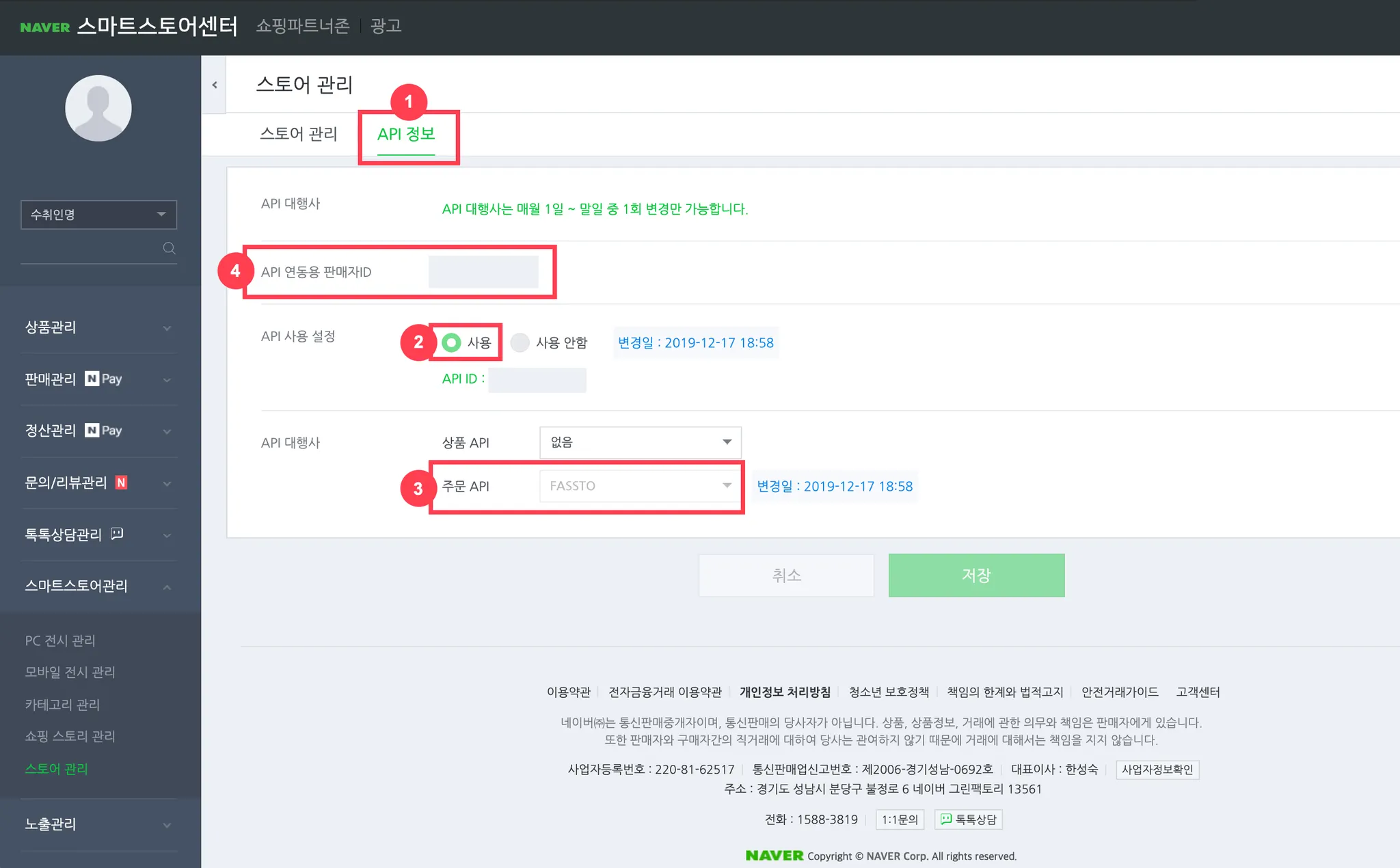 API 대행사 상품 & 주문 API를 ‘FASSTO’로 지정하고 저장해 주세요.