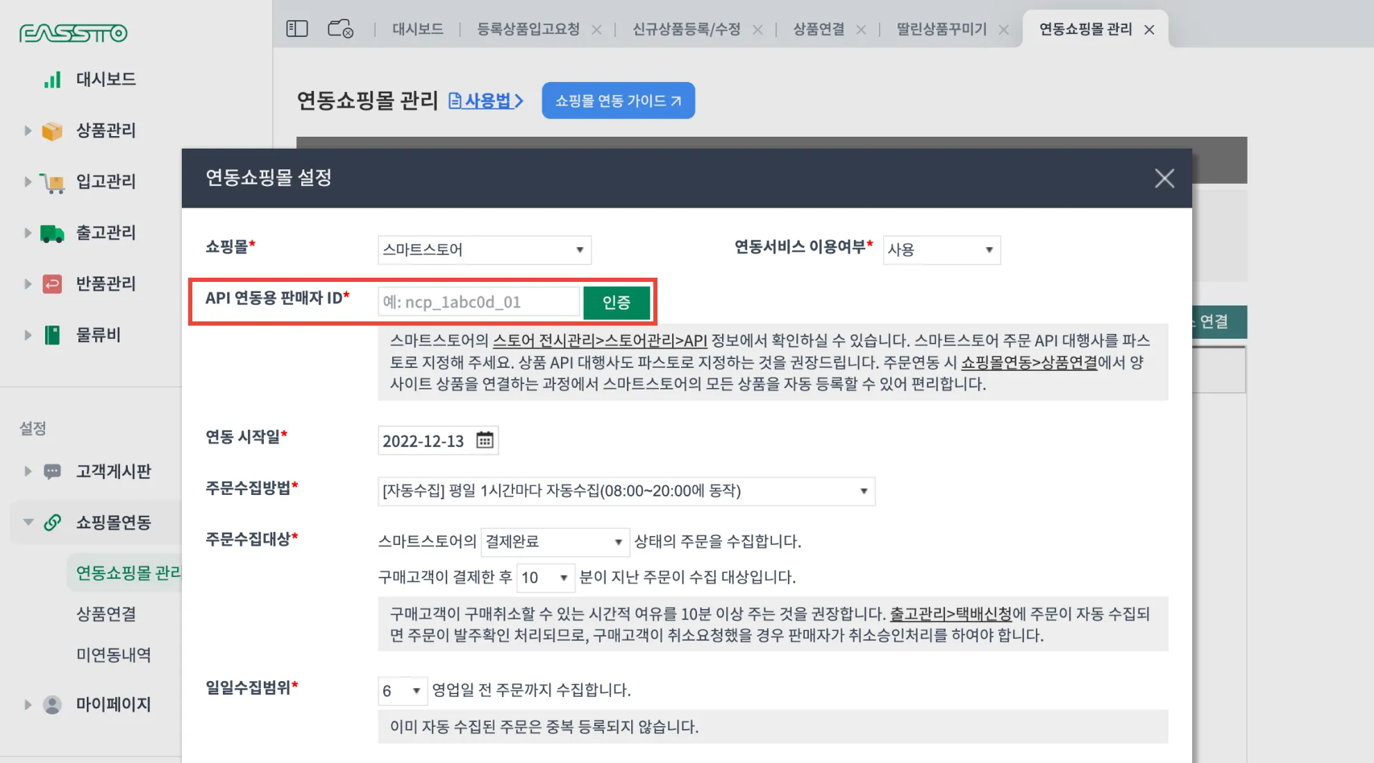 복사한 ‘API 연동용 판매자 ID’를 넣고 인증해 주세요.