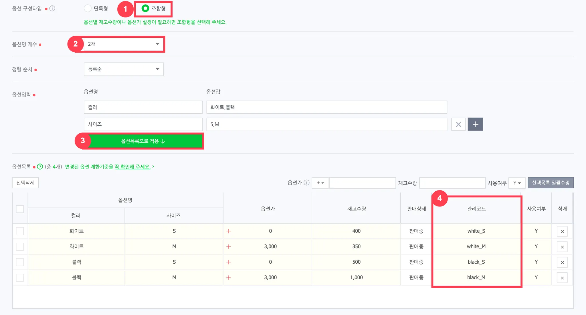 예 : ‘반팔티’ 옵션 - 화이트S, 화이트M, 블랙S, 블랙M