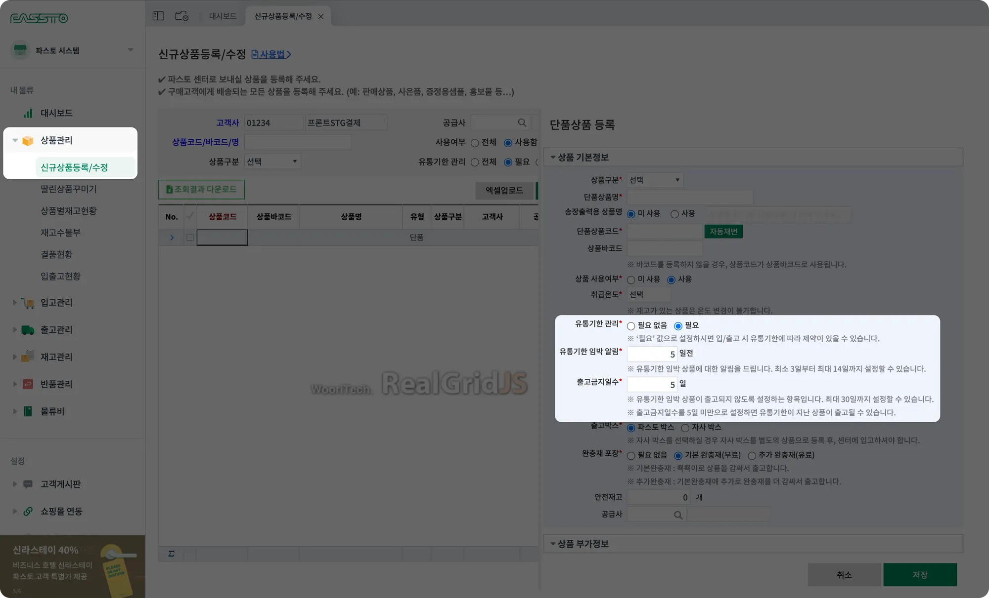 [상품관리>신규상품등록/수정]에서 모든 상품의 유통기한 관리 여부를 반드시 선택해 주셔야 합니다. 유통기한 관리 ‘필요(Y)’를 선택하면 유통기한 임박 알림(D-5 자동 설정), 출고 금지일(D-5 자동 설정)을 함께 지정할 수 있어 보다 철저한 관리가 가능해집니다. 단, 유통기한 임박 알림과 출고 금지일 설정에 따라 입고 및 출고에 제한이 생길 수 있으므로 꼭 확인 부탁드립니다.