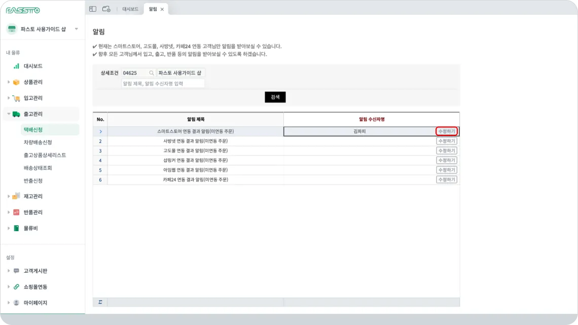 [마이페이지] - [알람] 화면에서 연결되어있는 쇼핑몰에 대한 알람 설정과 수신자 설정을 변경할 수 있어요. 수정하기 버튼을 누르시고 알람 받으실 항목을 선택해주세요.