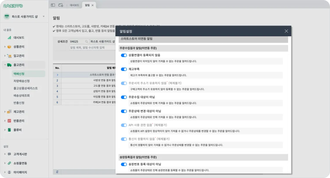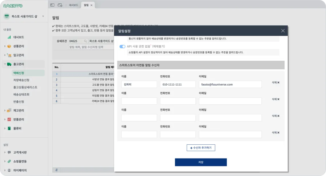 쇼핑몰 주문 및 송장에 대한 알림을 설정하고, 알림을 받을 연락처를 수정하고 조회하는 화면입니다.