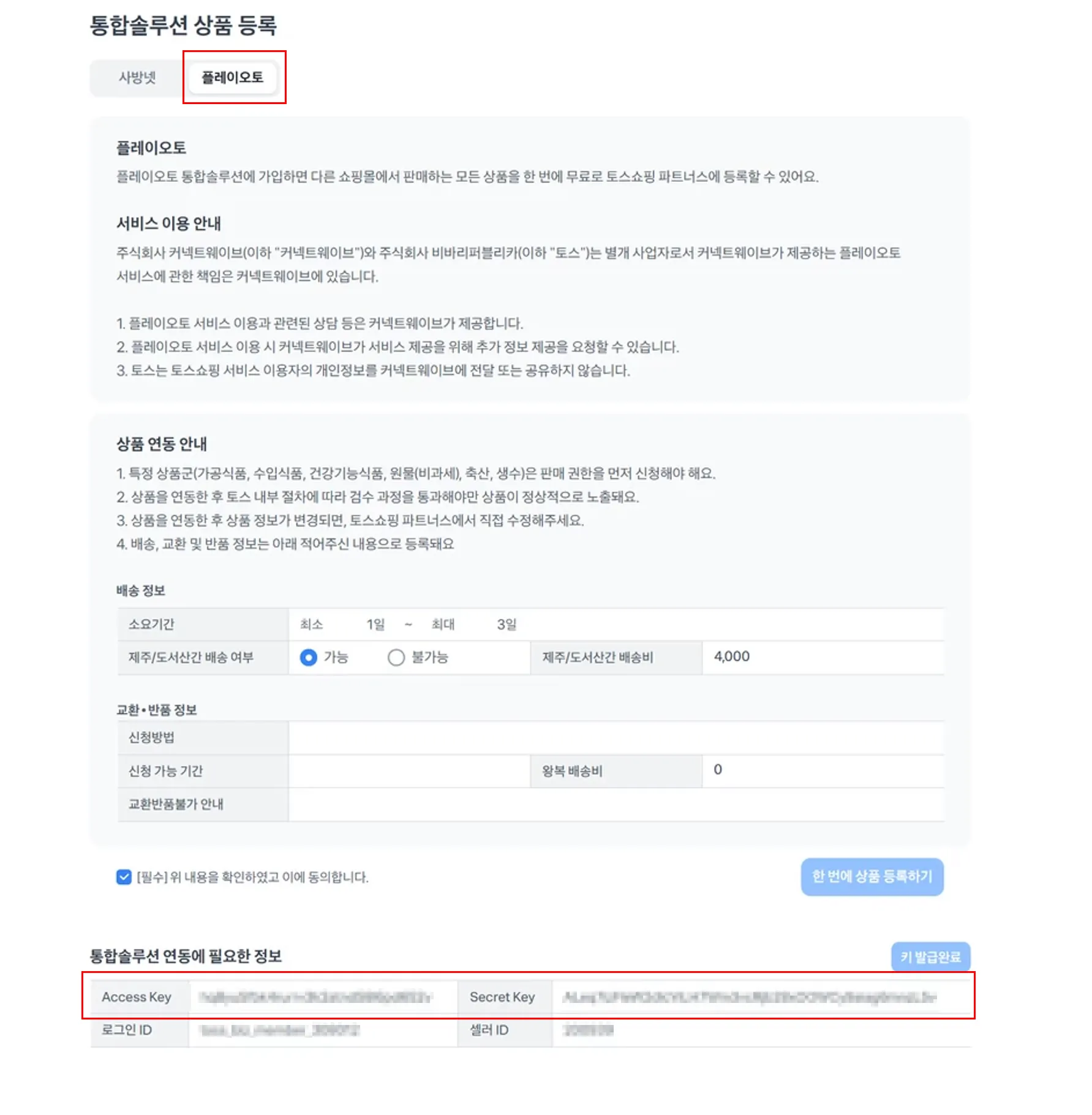 플레이오토 선택 후 Access Key/Secret Key 발급 후 FMS 쇼핑몰 계정 정보에 입력