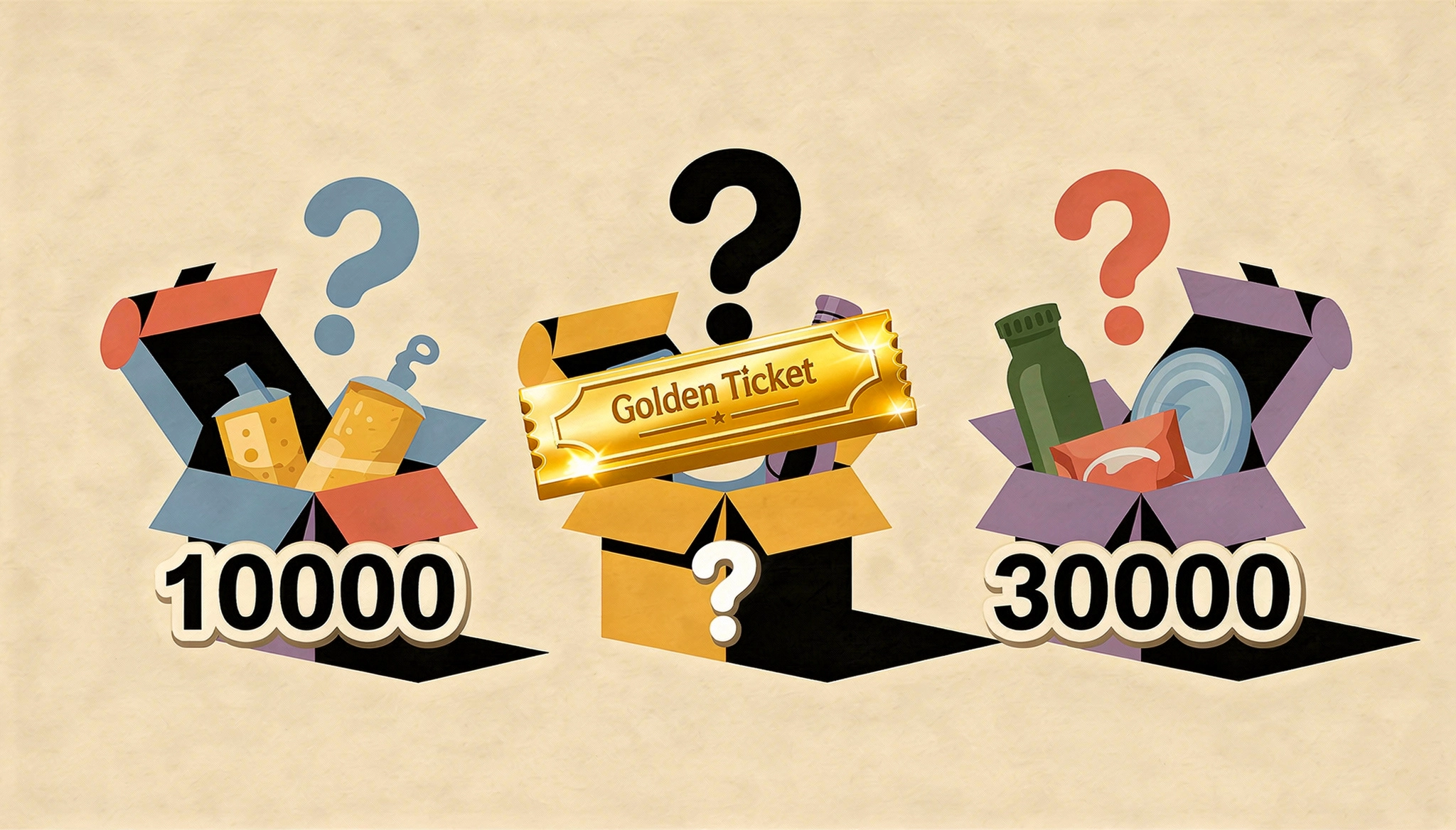 황금알(Golden Ticket) 배치: 100개 중 1~2개 박스에는 고가의 제품이나 가장 인기 있는 구성을 넣어 기대감을 극대화하세요. "나도 당첨될 수 있다"는 희망이 구매 버튼을 누르게 만듭니다.