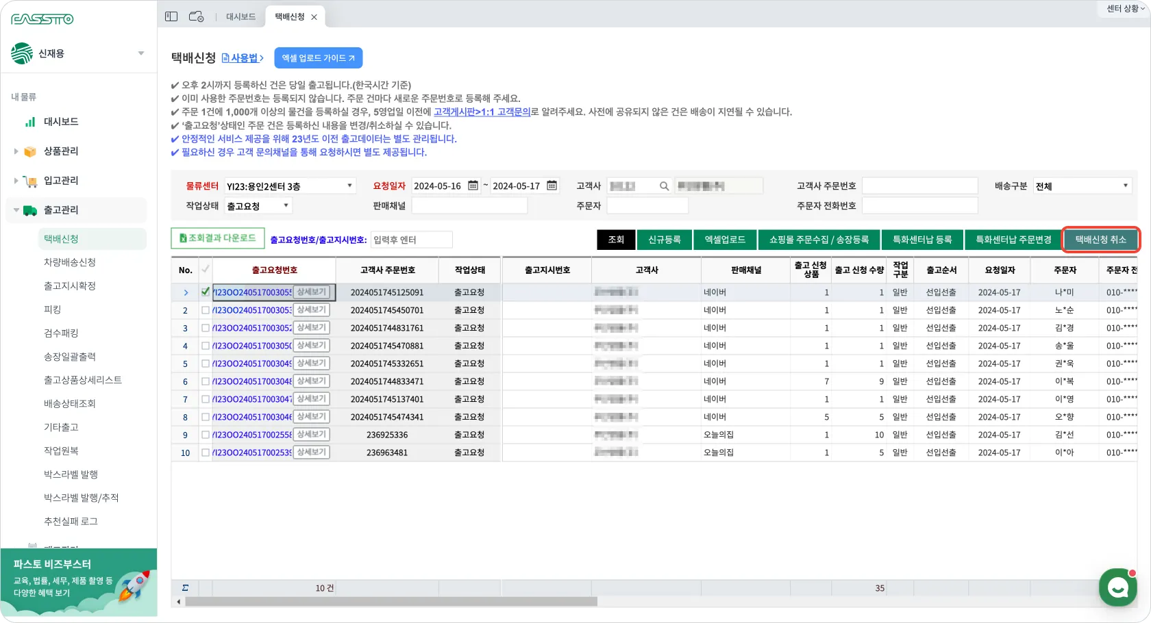 취소하려는 출고요청건 체크 후 [택배신청 취소] 버튼을 클릭하세요.