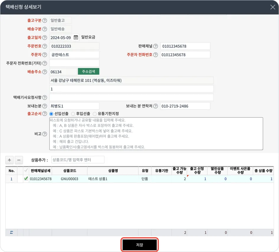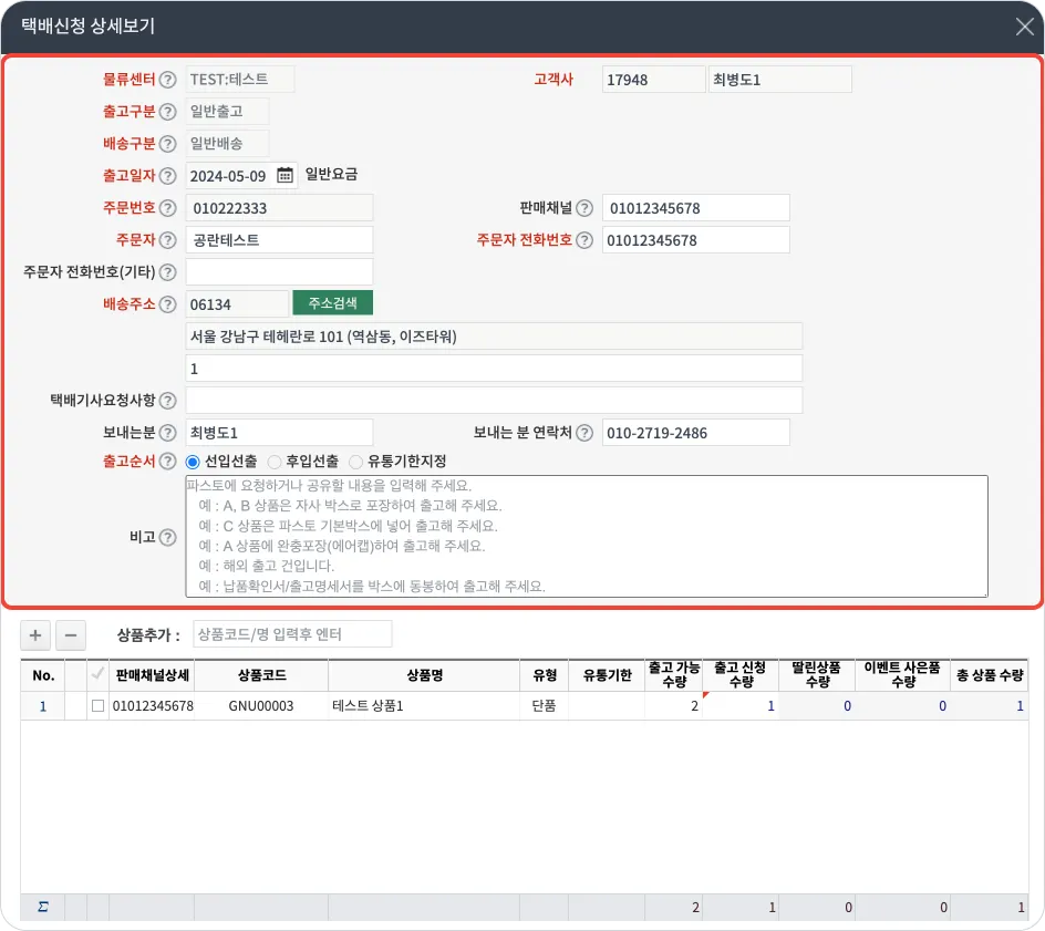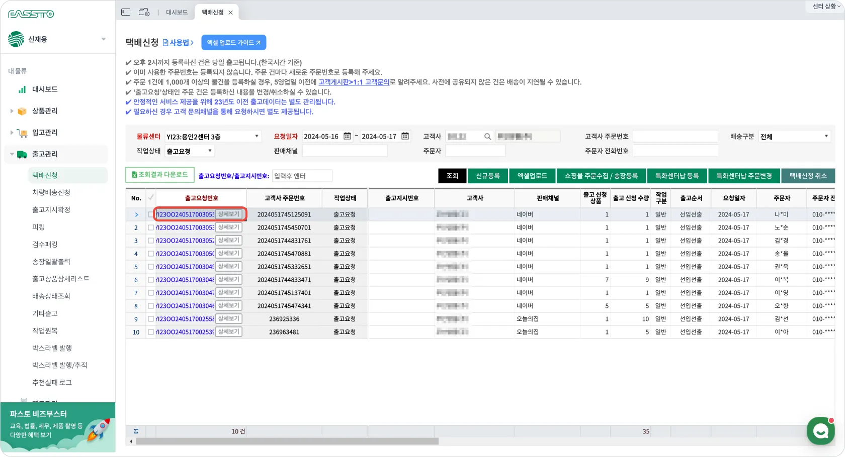 ① 출고 요청건의 고객 정보를 확인합니다. (주문번호,주문자명,주문자 연락처 등으로 정보를 조회할 수 있습니다.)