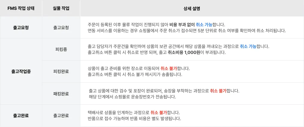 ’출고작업’ 이후에서는 내부 피킹작업 전까지만 취소 가능하나 1,000원의 출고 취소 수수료가 발생합니다.