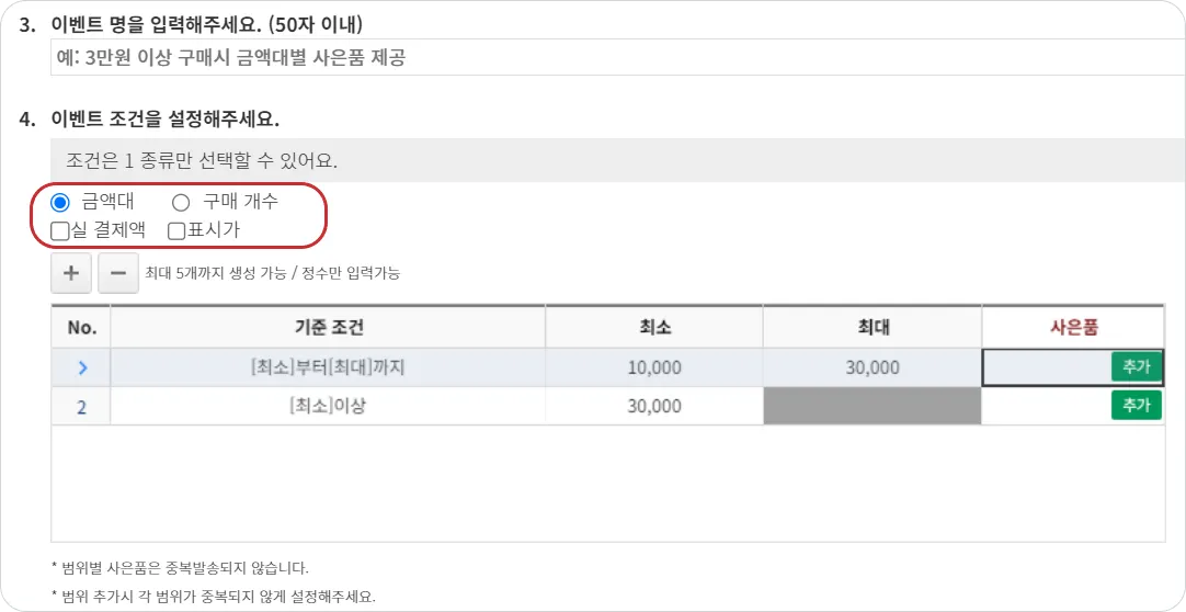 ※ 기준 조건 [최소] 이상 [최대]이하 일 경우 최소값과 최대값을 동일하게 입력하실수 있습니다.