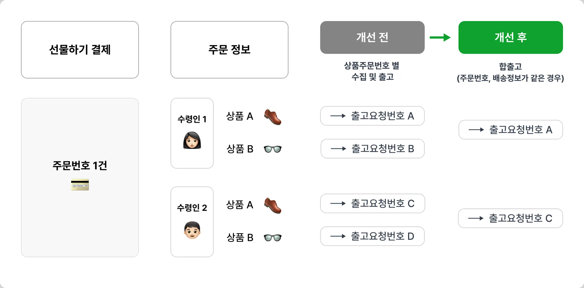 8월 22일부터 선물하기 주문의 주문번호와 배송정보 (수령인, 주소)가 동일한 경우 합포장 출고됩니다.
