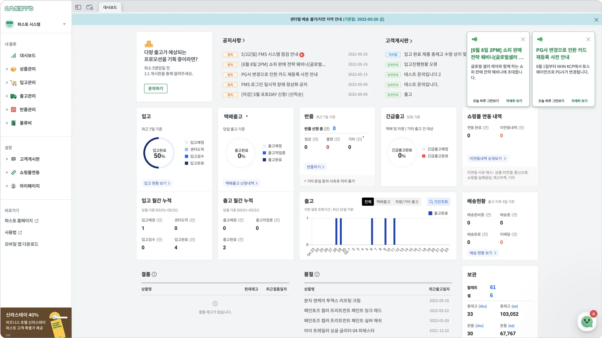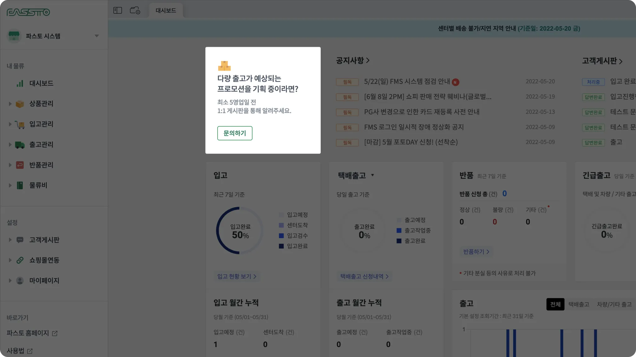 평소 출고건보다 많은 출고가 예상되는 프로모션을 진행하실 경우 채널톡이나 문의하기를 통해 알려주세요!