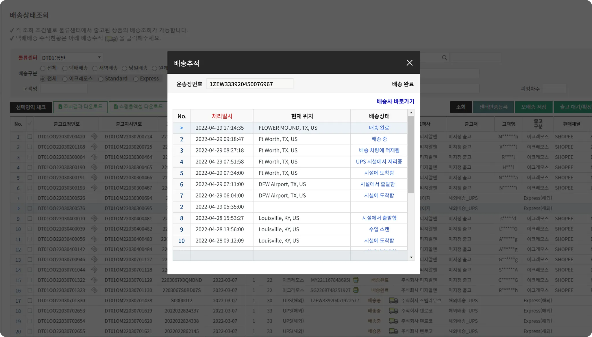 센터에서 출고되는 모든 국내 택배사의 배송상태를 보다 상세히 확인할 수 있습니다.