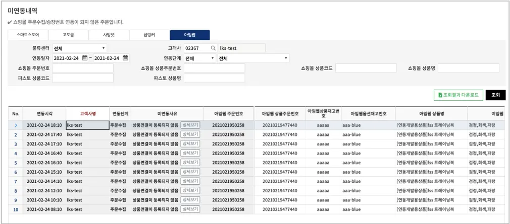FMS ‘쇼핑몰연동 > 미연동내역’의 해당 쇼핑몰 탭에서 확인 가능합니다.