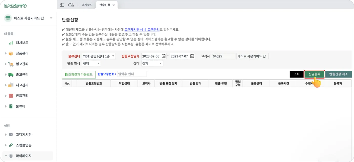 1. [출고관리] > [반출신청] 화면에서 신규등록 버튼을 눌러주세요.