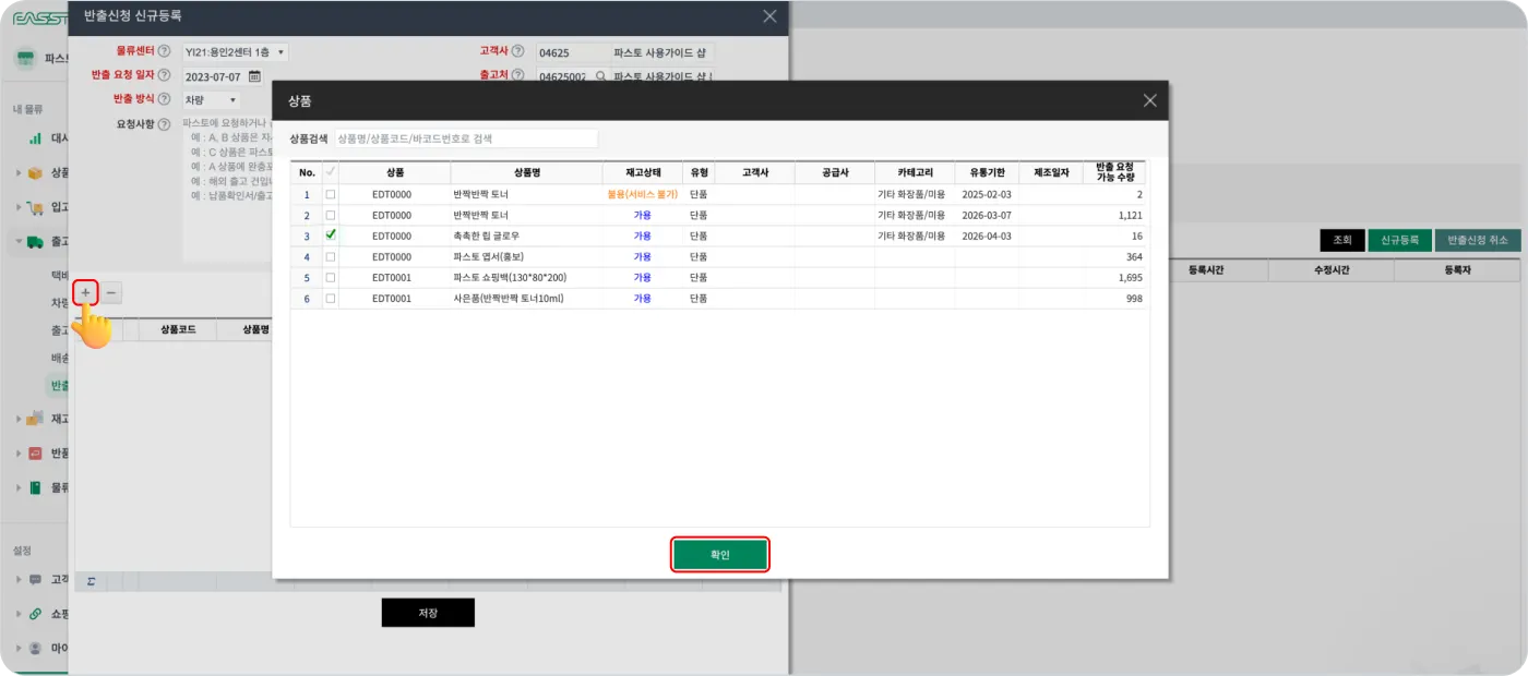 3. [+] 를 눌러 반출신청할 상품을 선택하세요
