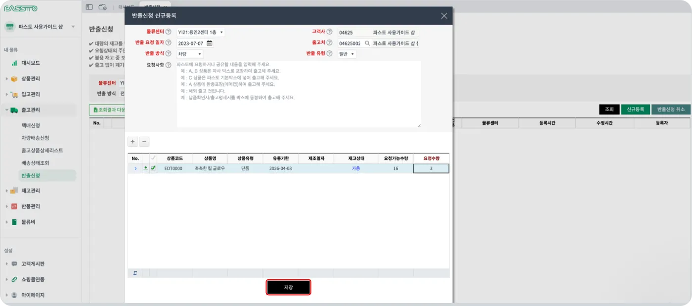 4. 반출할 상품의 요청 수량을 수정 후 저장을 눌러주세요.