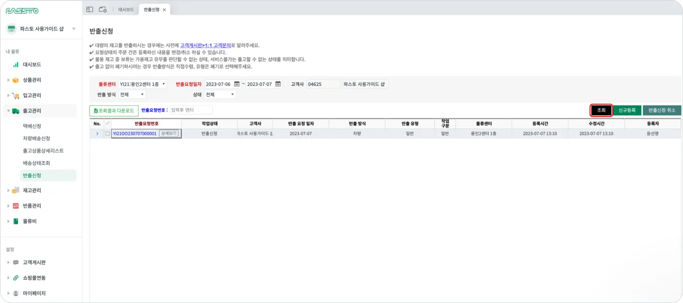 5. 반출신청 완료 후 조회를 누르면 신청 된 반출건 조회가 가능합니다.