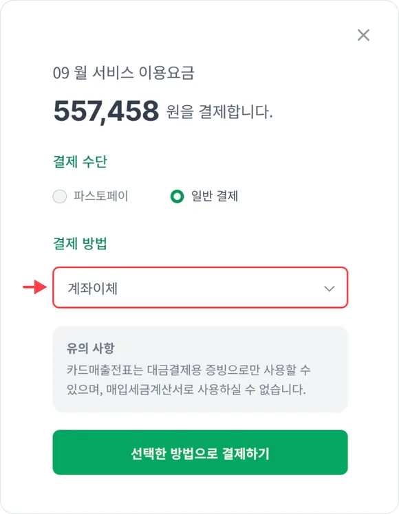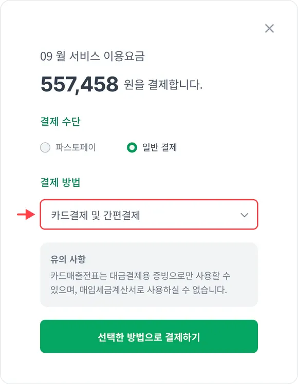 결제창에서 결제수단을 일반결제로 선택하시고, 결제방법을 카드결제 및 간편결제로 선택하시면 결제가 가능합니다.