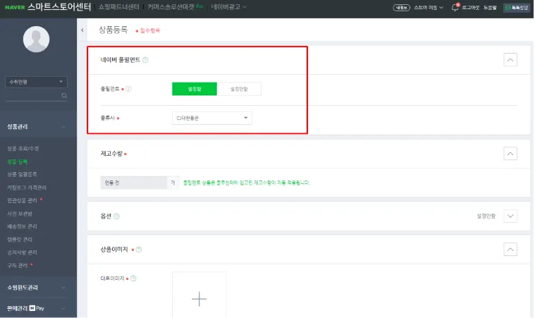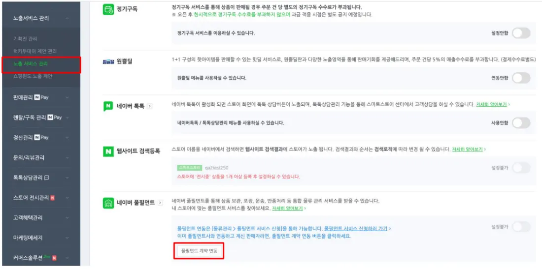 경로 : 노출관리 → 노출 서비스 관리 → 네이버 풀필먼트