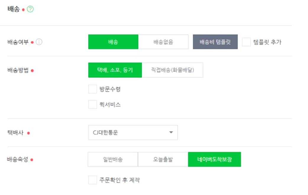 상품별 배송속성을 [일반배송, 오늘출발, 네이버도착보장] 중 네이버도착보장으로 선택