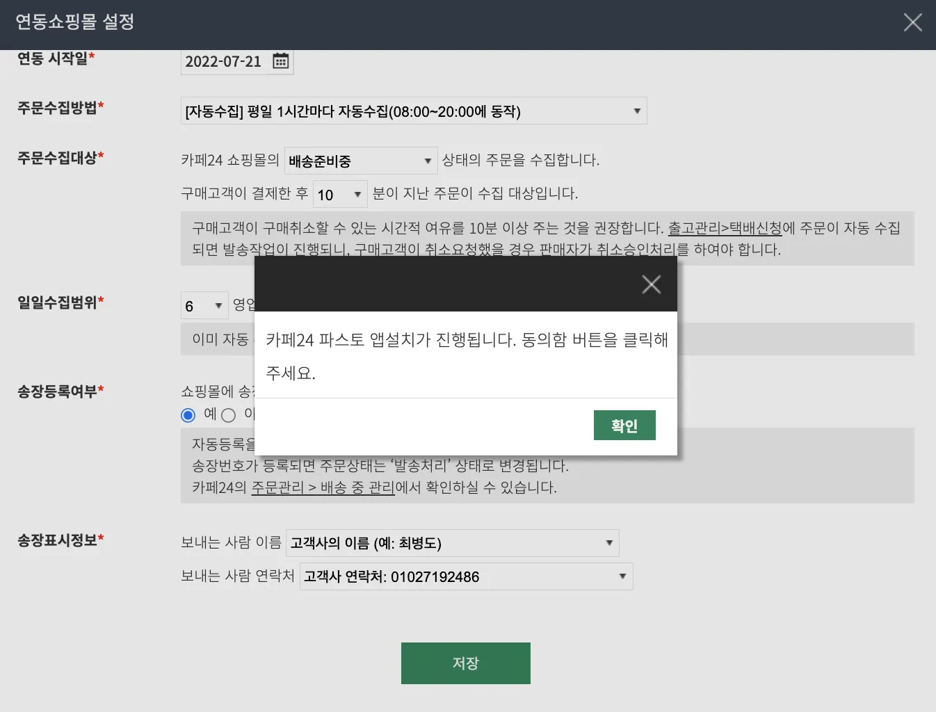FMS에서 연동설정 완료 후 저장버튼을 클릭하면 카페24 파스토 앱을 설치하는 절차가 진행됩니다.